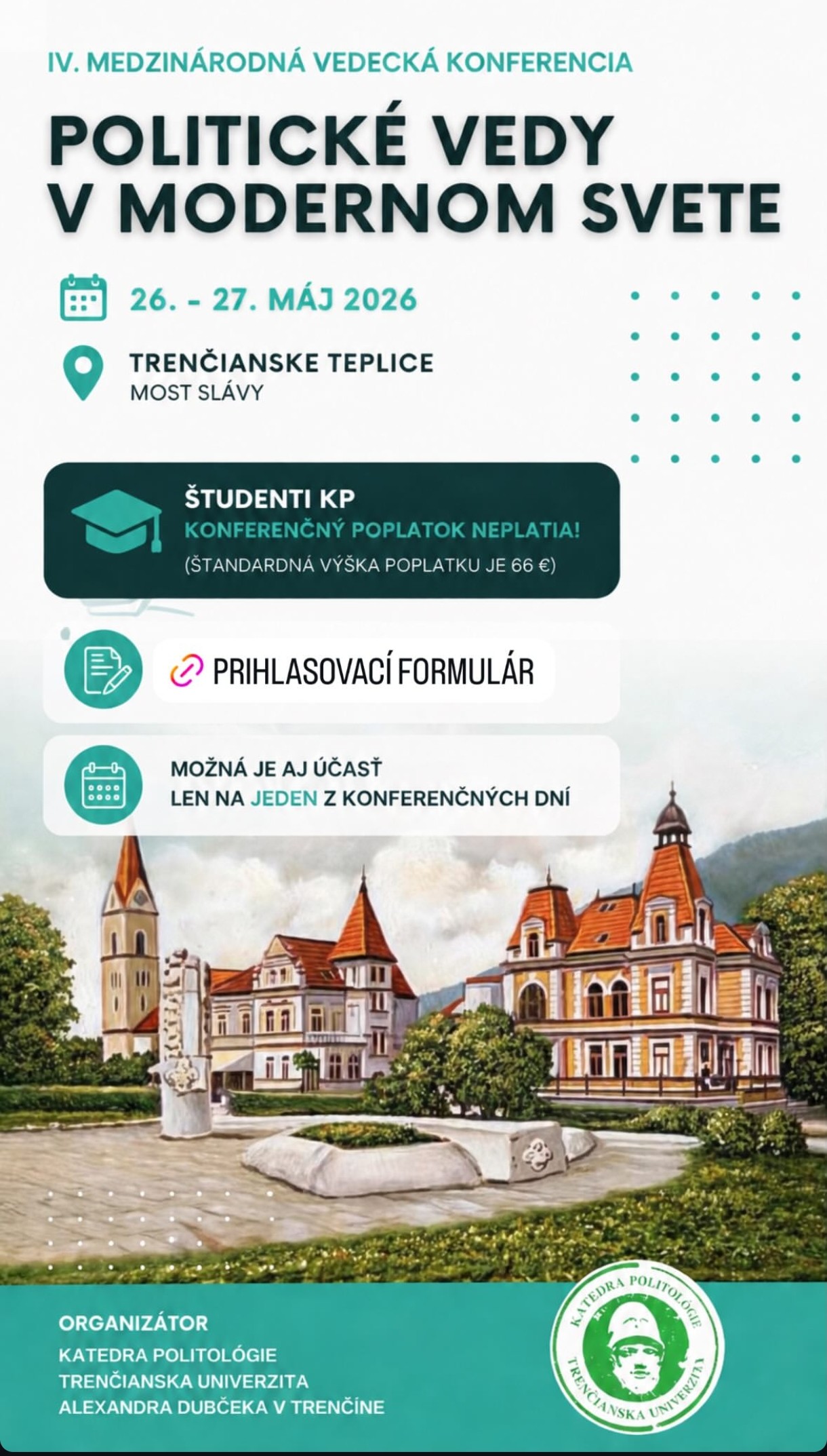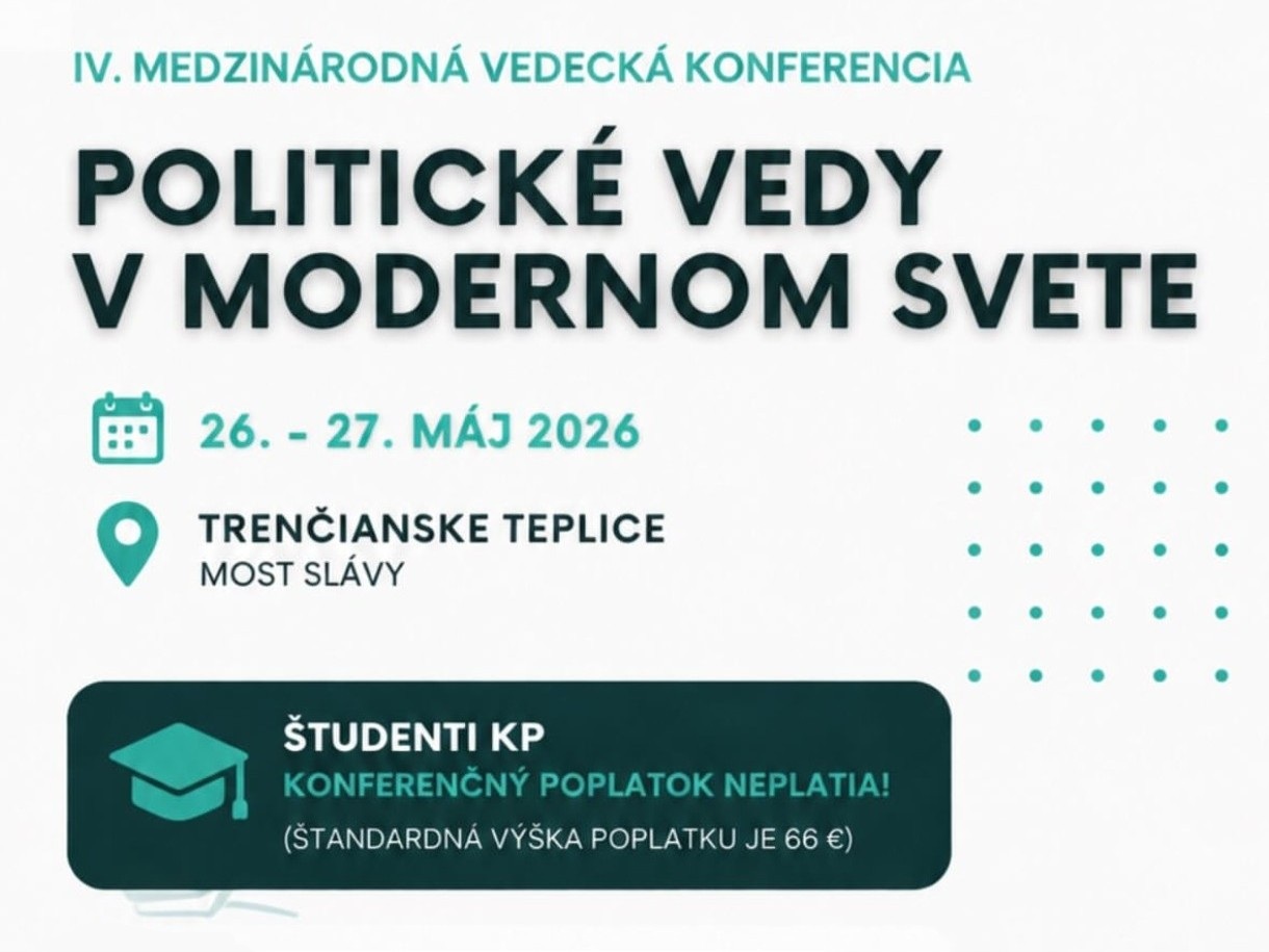 Pozývame vás na IV. ročník medzinárodnej vedeckej konferencie „Politické vedy v modernom svete“ s podtitulom Politika v čase zásadnej transformácie: interdisciplinárne pohľady na moc, technológie a spoločnosť, ktorú organizuje naša Katedra politológie TnUAD.