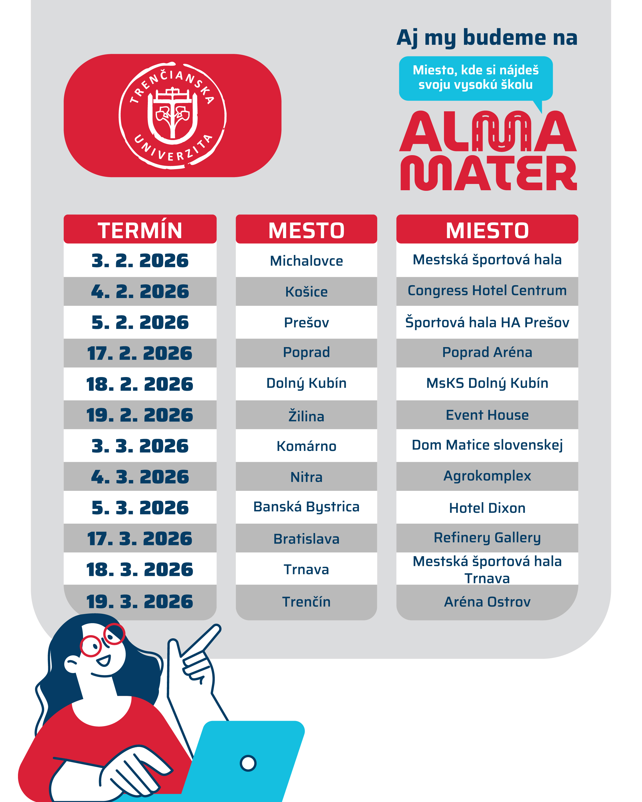 Prehľad miest a termínov: https://www.minedu.sk/veltrh-vysokych-skol-alma-mater/